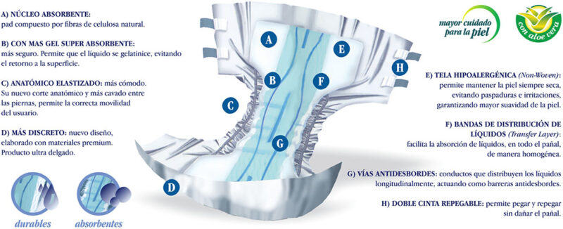 Línea de pañales con diseño anatómico elastizado, juvenil y adultos. Más cómodos, mayor cantidad de gel, doble cinta repegable, ultra delgado. Facilita la movilidad del usuario otorgando mayor independencia. Con vías anti desbordes y cubierta interior de tela hipoalergénica con aloe vera de suave textura.