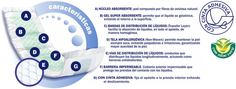 Con gel súper absorbente. Cubierta interior de tela hipoalergénica que permite mantener la piel siempre seca. Núcleo absorbente y cubierta exterior impermeable que protege las prendas del contacto con los líquidos. Con cinta adhesiva para fijar a la prenda interior.